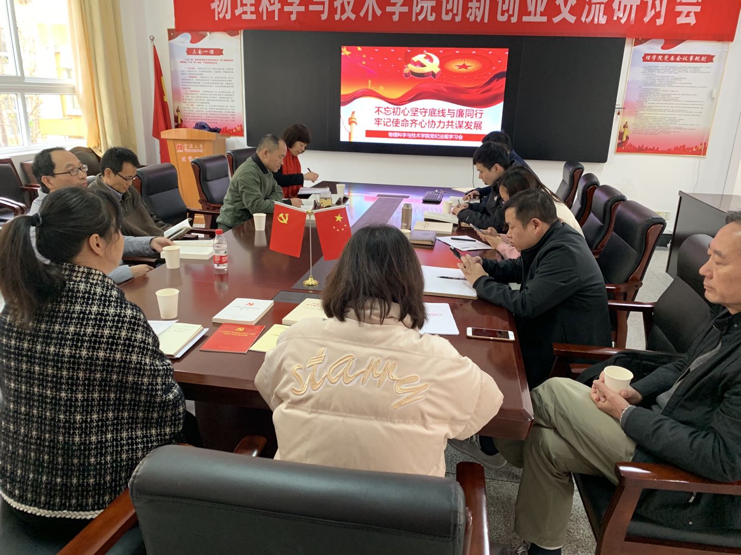 为深入学习贯彻习近平新时代中国特色社会主义思想和党的十九届四中全会精神,自觉践行“两个维护”,不断加强党风廉政建设,进一步提升教师的廉洁自律意识,营造风清气正的育人环境。11月28日下午,物理学院在116会议室召开党风廉政教育之党纪法规专题学习会,学习了《中国共产党廉洁自律准则》《作风建设口袋书》和《中国共产党问责条例》(新修订)的有关规定,学院党政领导班子、系主任、行政办公室主任、团队负责人、支部书记等参加会议。