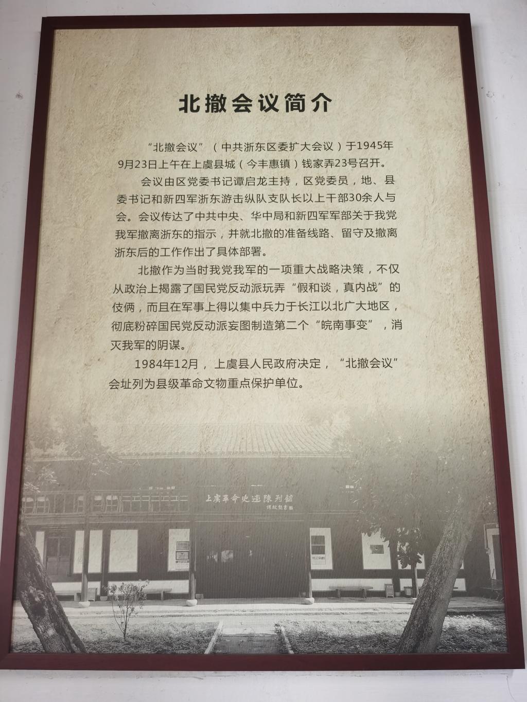 北撤旧址见证了这一伟大的历史事件,犹如一座历史的丰碑载入史册。在北撤会议旧址上建起“上虞革命史迹陈列馆”,恢复了当年北撤会议的场景,同时还展出了新民主主义革命时期上虞党组织的重要活动史料。