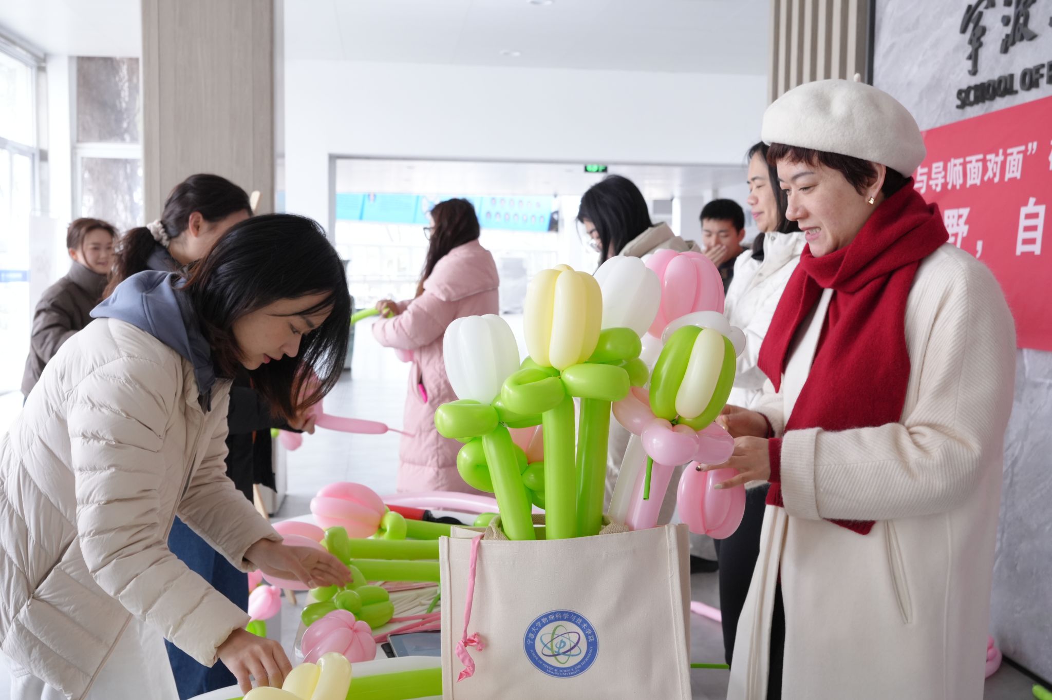 活动伊始,大厅中央的花朵画板便成为焦点。现场的女同学们手持马克笔,纷纷书写对女性榜样的敬意与祝福,画板被五颜六色的文字覆盖,宛如一幅汇聚集体记忆的“她力量”画卷。与此同时,郁金香气球花摊位前也排起长队,活动现场共送出100余朵气球花,许多师生将照片分享至社交平台,形成线上线下的温情联动。