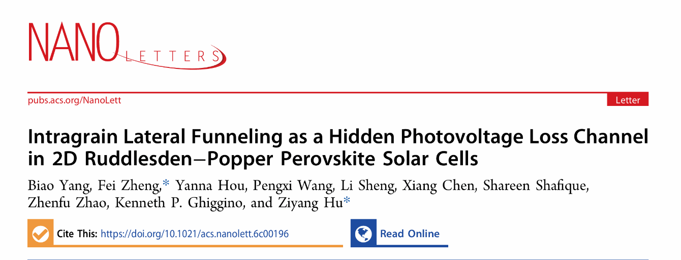 近日,番茄小说 郑飞教授与胡子阳教授团队在二维钙钛矿太阳能电池光电压损失机制研究方面取得重要进展,相关成果以研究论文 “晶粒内部横向输运作为二维Ruddlesden–Popper型钙钛矿太阳能电池中隐藏的光伏电压损失通道” 发表在国际权威期刊《纳米通讯》(Nano Letters)上。番茄小说 硕士研究生杨彪为论文第一作者,郑飞、胡子阳为通讯作者,合作者包括澳大利亚墨尔本大学的Kenneth P. Ghiggino教授。