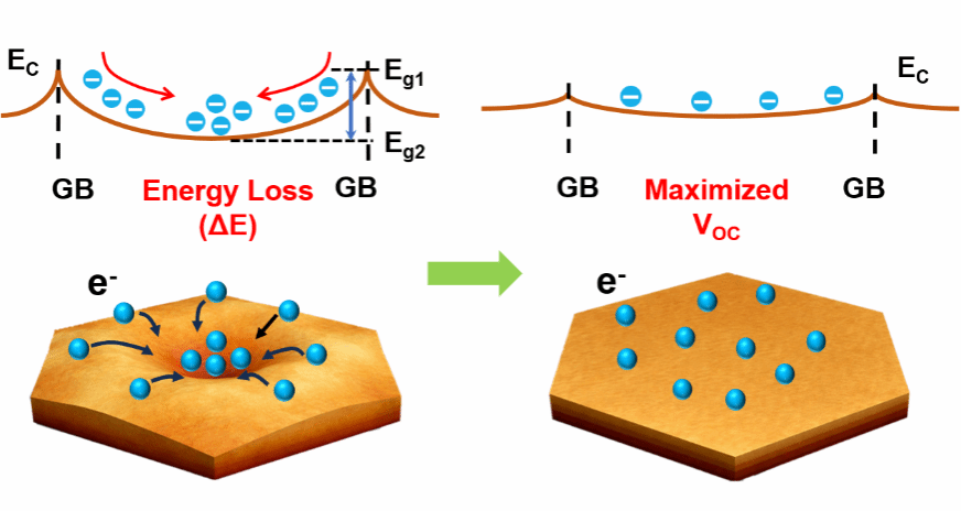二维Ruddlesden–Popper钙钛矿太阳能电池因具有良好的环境稳定性而受到广泛关注,但其显著的开路电压损失(VOC Loss)限制了器件的光电转换效率。针对这一问题,研究团队通过包括原子力探针显微镜、荧光寿命成像在内的多种微纳表征手段,揭示了二维钙钛矿晶粒内部存在横向相分布梯度,并发现该梯度会形成晶粒内部“漏斗型”能量景观,驱动光生载流子从晶界(GB)向具有较低带隙的晶粒中心(GI)弛豫,从而造成光伏器件的光电压损失。