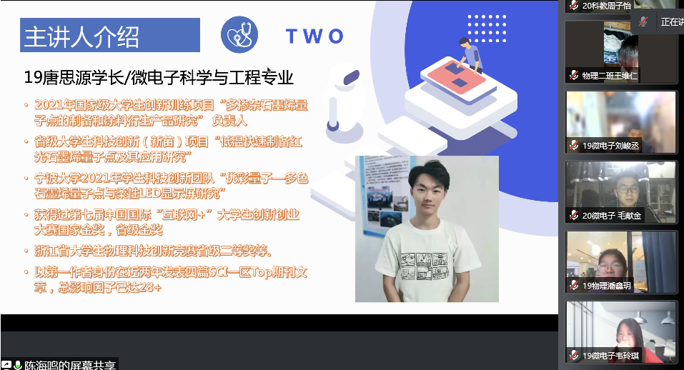 本次科研育苗分享会在同学们之间产生了热烈反响,让同学们对科研创新有了进一步的认识,同时也是物理学院弘扬优良学风的一次重要践行。“对真理和知识的追求并为之奋斗,是人的最高品质之一”。作为新时代的新青年,物院学子接过了历史的接力棒,以创新精神激荡蓬勃青春!