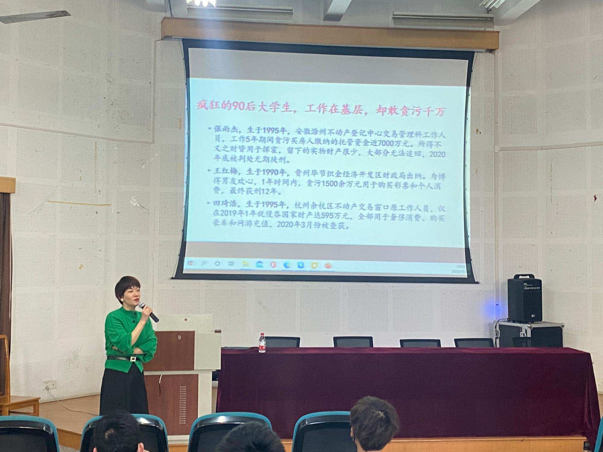 时时以案为鉴,永远警钟长鸣。在理清廉政发展的脉络后,刘书记由大入微,与同学们互动,询问大家身边存在的不廉洁现象。随着讨论互动的深入与刘书记深入浅出的阐述,台下的同学们恍然大悟,原来闪动作弊、考试作弊、选举拉票、逃课等行为都属于不廉洁行为。刘书记总结,不廉洁行为并不遥远,也并不只与官员、党员相关,而就在我们身边。刘书记通过分享“因为考试舞弊而无法拿到毕业证”、“由于闪动校园作弊被取消评奖评优的资格”等等发生在校园内、与同学们切身利益息息相关的案例为与会同学们敲响了警钟。