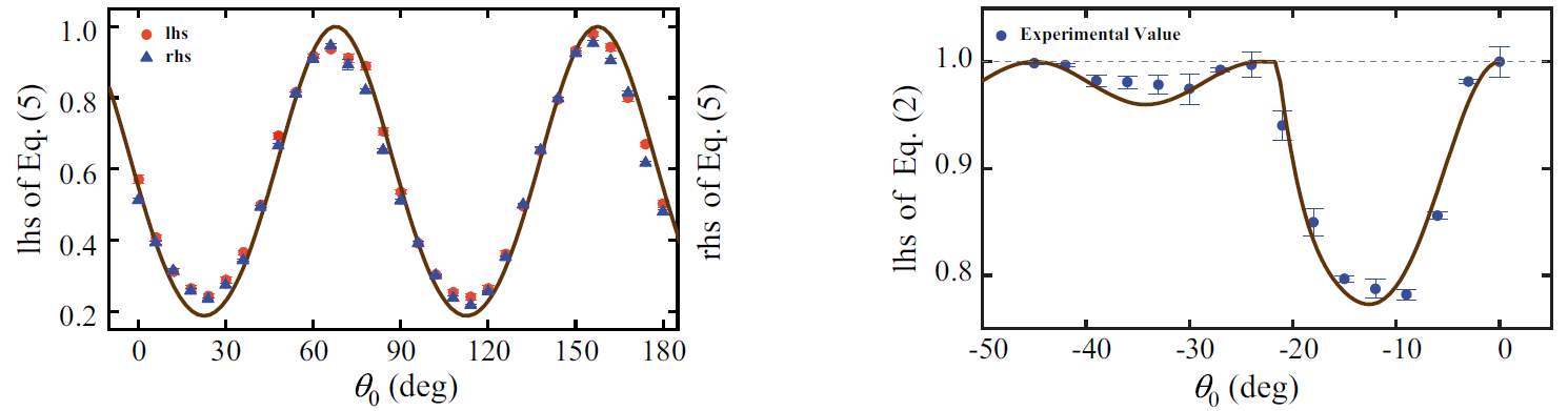 图2 实验结果图. 左图: 非厄米算符A和B都是实数,不同初态下不确定关系的实验点和相对应的理论曲线。右图: 非厄米算符A和B都是复数,不同初态下不确定关系的实验点和相对应的理论曲线。