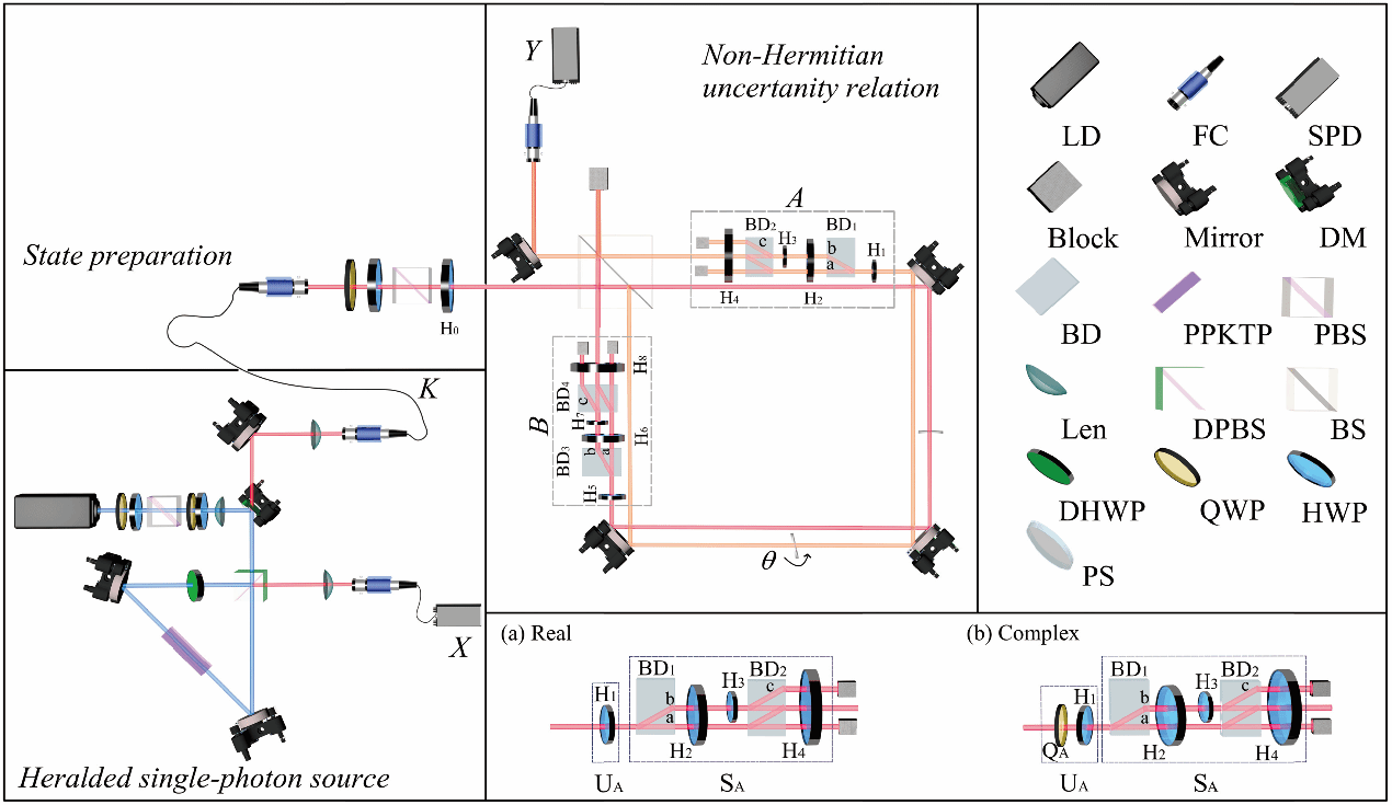 图1 实验装置图. 在两种情况(实数和复数)下测试两个非厄米算符A和B之间不确定关系的实验装置。图左下部分展示了实验中用到的宣布式单光子源。在实验上采用“大干涉环嵌套小干涉环”的方法来实现非厄密算符不确定关系的验证,非厄密操作的实现则通过“小干涉环”丢失一部分光子实现。图中(a)和(b)分别表示实数和复数情况下的非厄密操作。