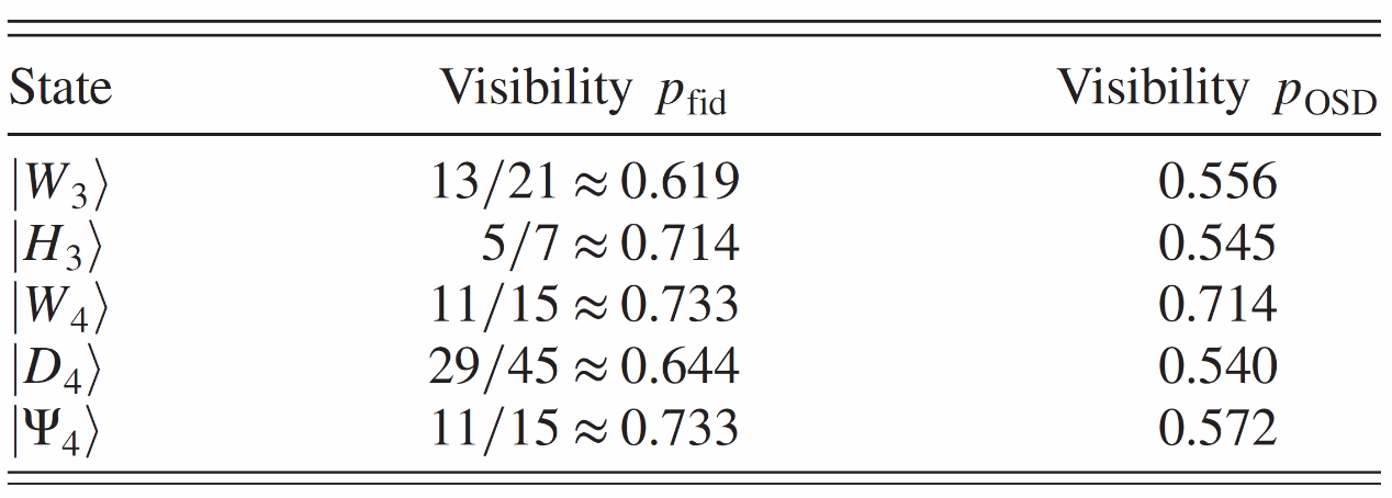 描述纠缠态是量子信息科学的核心。用于检测纠缠态的特殊可观测量,称为纠缠目击者,是完成这项任务的常用工具。通常,这些纠缠目击者的构建依赖于以下观察结果:与某个目标纠缠态具有高保真度的量子态也是纠缠的。在表1中,基于保真度的纠缠目击者需要可见度pfid ≥ 0.620才能检测到3量子比特W态全局纠缠。而基于算符空间中施密特分解(OSD)的纠缠目击者所需的可见度降低到pOSD ≥ 0.556,这证明了OSD目击者优于基于保真度的构建。OSD目击者也可应用于各种其他多量子比特态。这包括3量子比特的均匀超图态和4量子比特的W态、Dicke态以及单态。对于所有这些态,它们的噪声鲁棒性都能被显著提高。