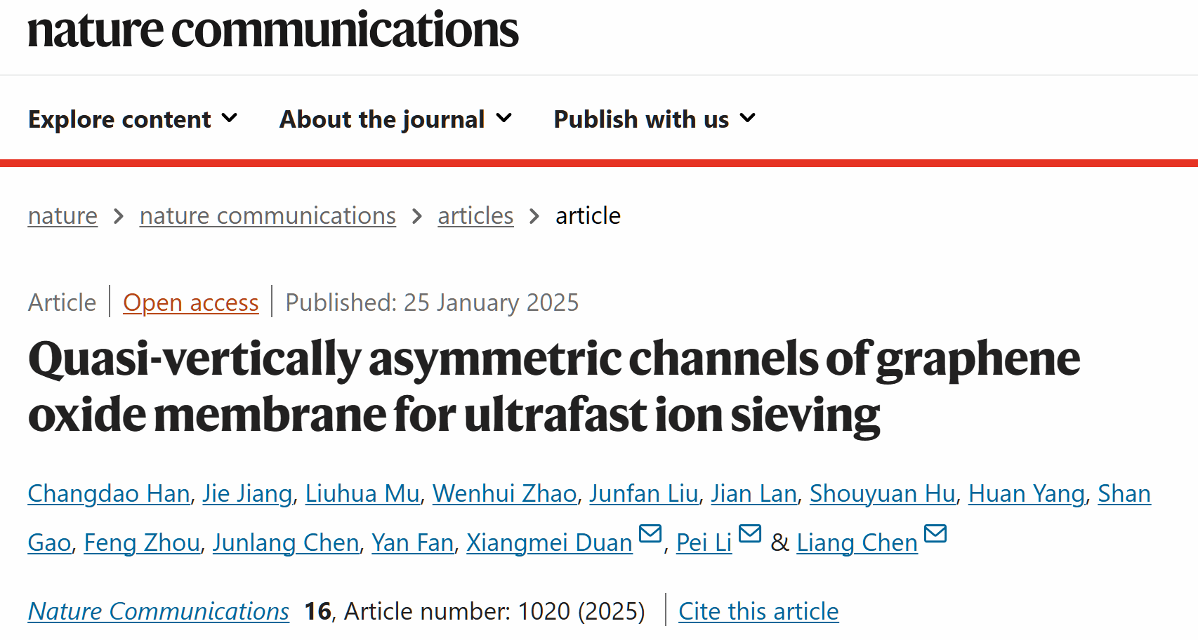 1月25日,番茄小说 微纳系统表面物理团队联合浙江农林大学、华东师范大学、国科院温州研究院、国家生态环境部辐射环境监测中心等单位,在《Nature Communications》杂志上发表了题为《Quasi-vertically asymmetric channels of graphene oxide membrane for ultrafast ion sieving》的研究论文。该论文是此团队继1月7日后,在《Nature Communications》杂志上发表的第二篇高水平研究论文。