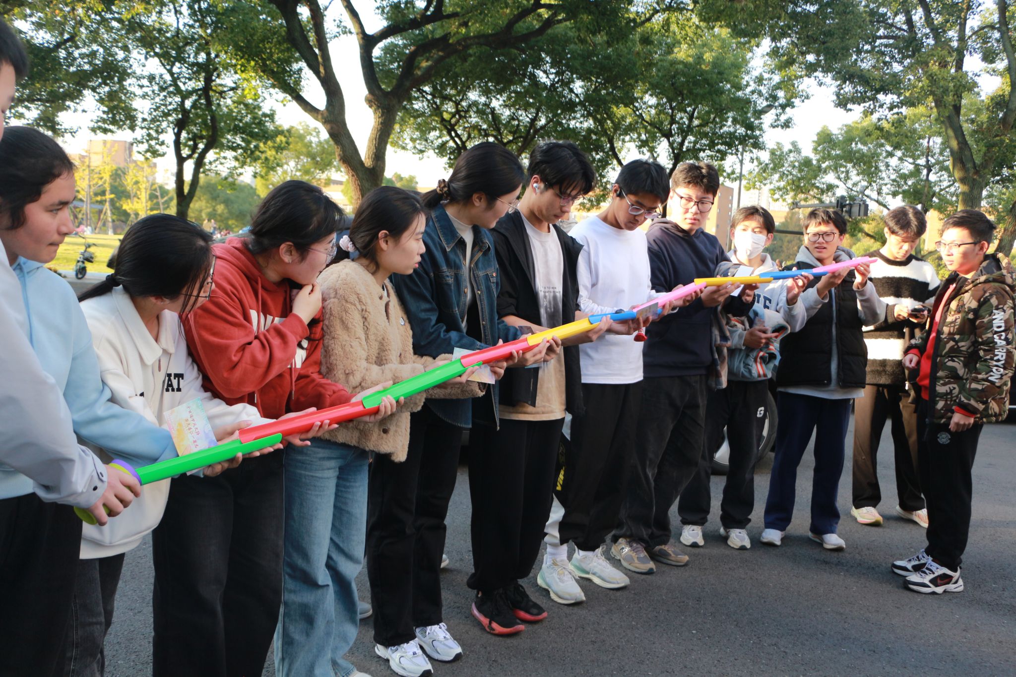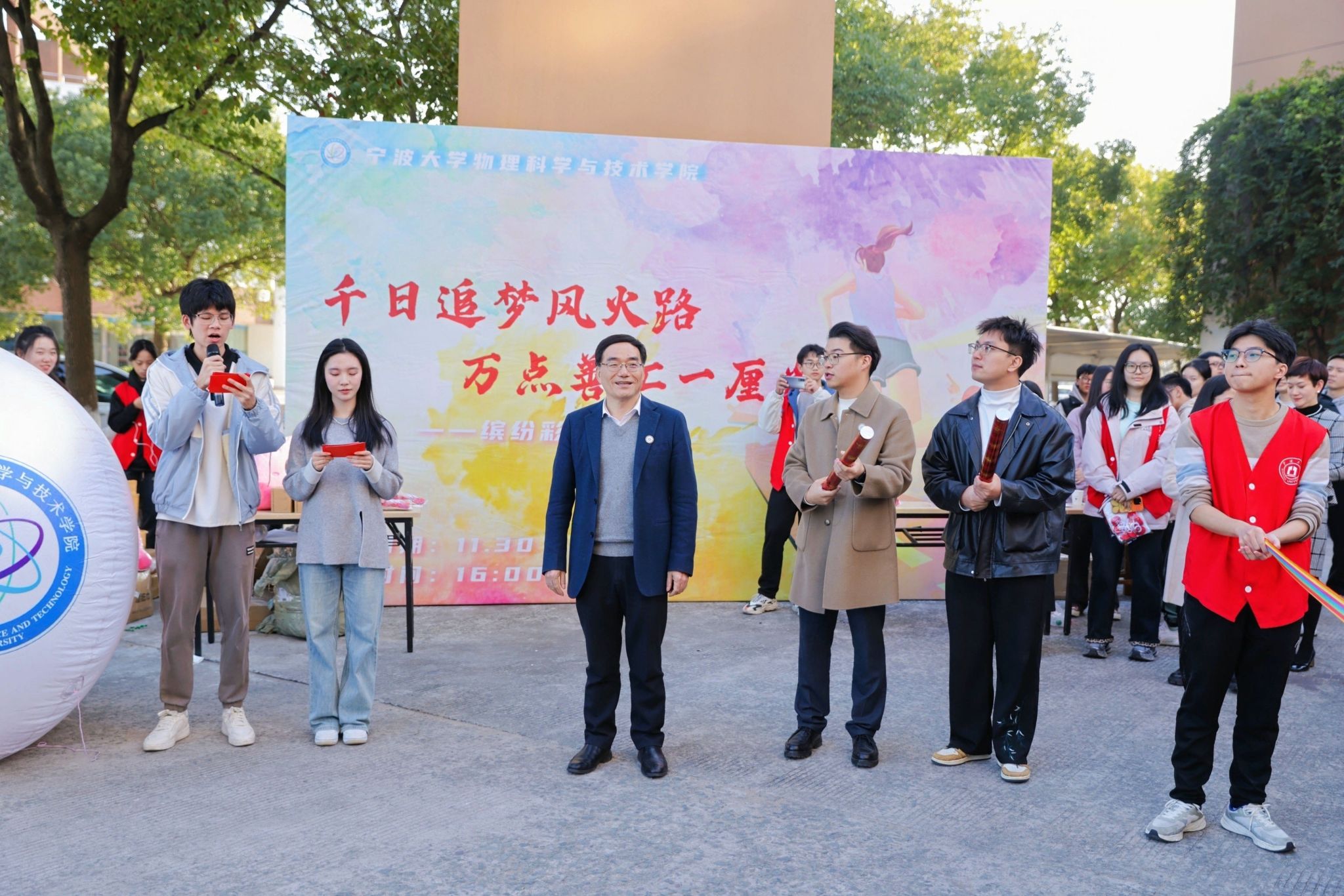 当日下午,来自十余个学院的师生和返校的物院校友们共计200余人齐聚于龙赛理科楼前,蓄势待发;工作人员们有条不紊,一切准备就绪,大家都以饱满的热情迎接即将到来的活动。在彩带飞舞和在礼炮齐鸣中,校长蔡荣根院士宣布彩虹跑开跑。随着蔡校长的一声令下,参与者们一齐冲出起跑线、奔向各个活动打卡点。
