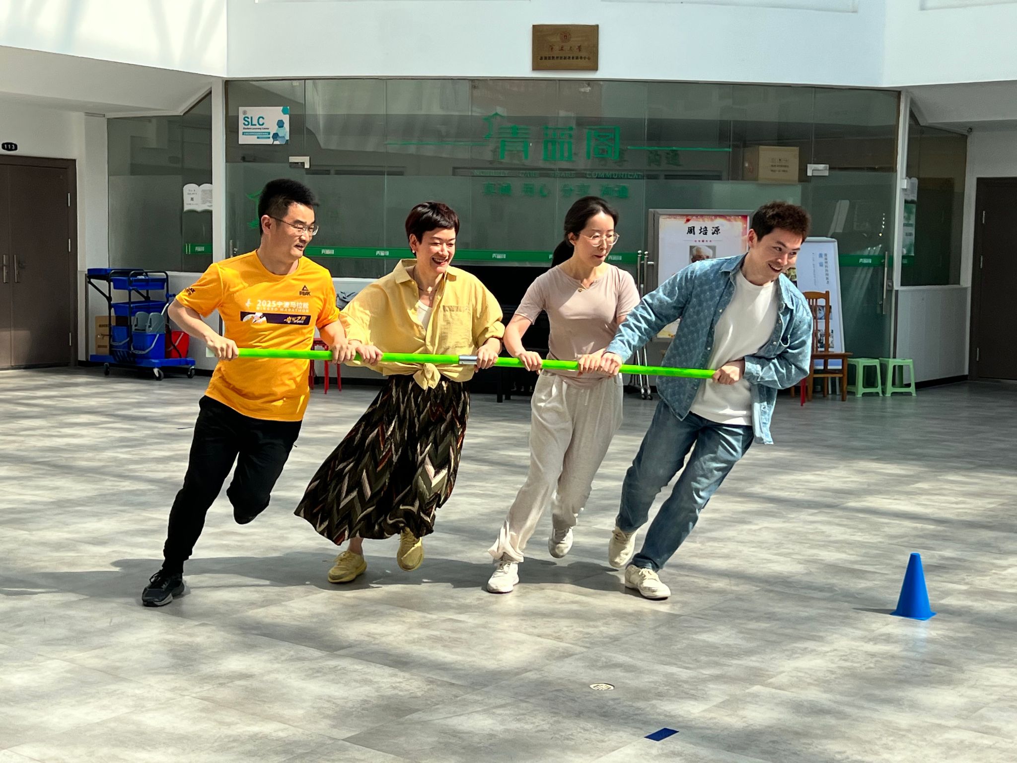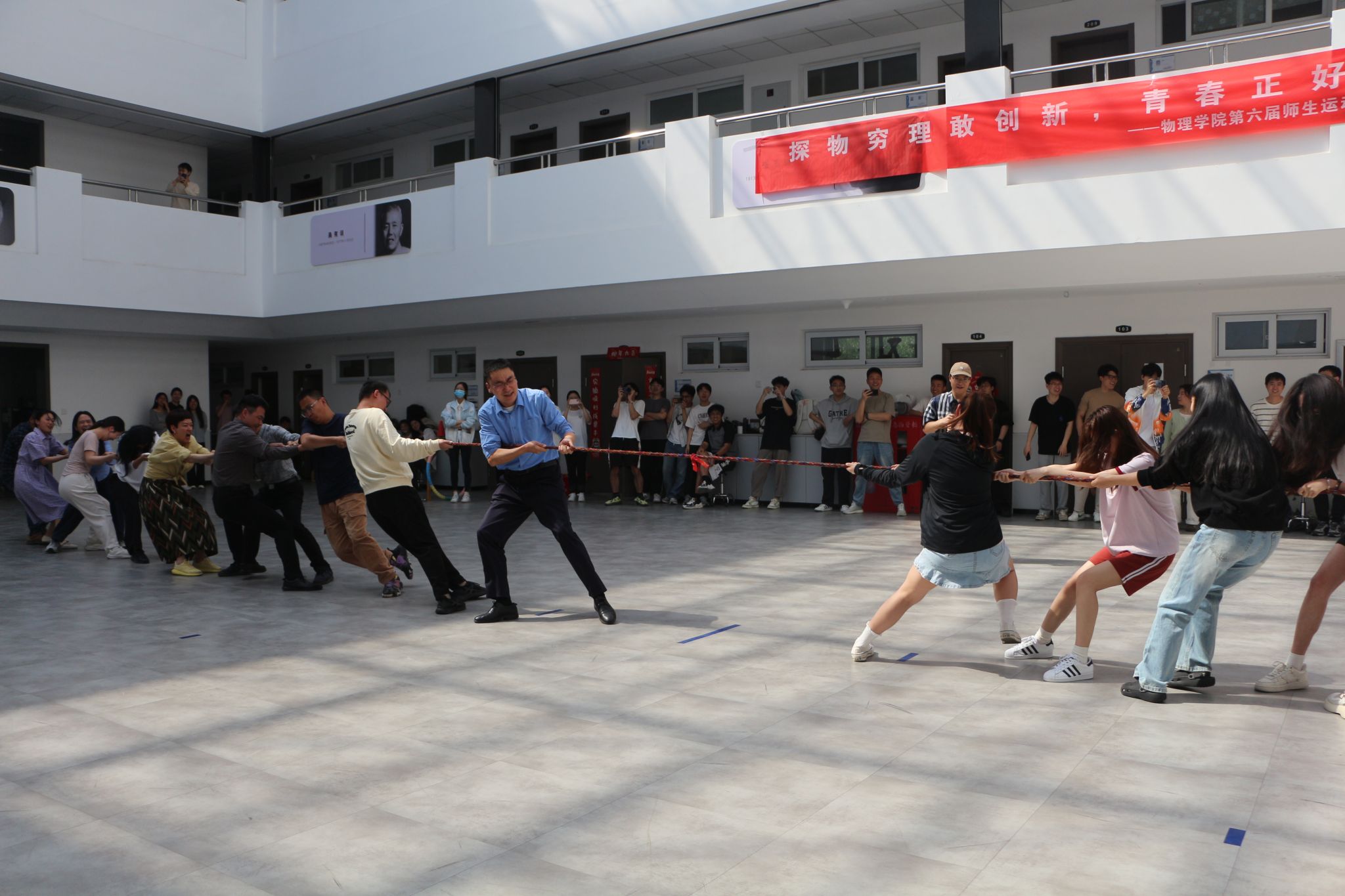 在紧张刺激的拔河角逐之后,四支队伍轮流参与到旋风跑、鸡毛信、一圈到底、无敌风火轮等趣味项目中。这些项目考验着师生间的默契,一次次的失败和一次次的尝试,直至成功后的欢呼雀跃,大家在一次次尝试中不断磨合,不言放弃,充分彰显了物理人坚韧不拔的精神风貌。