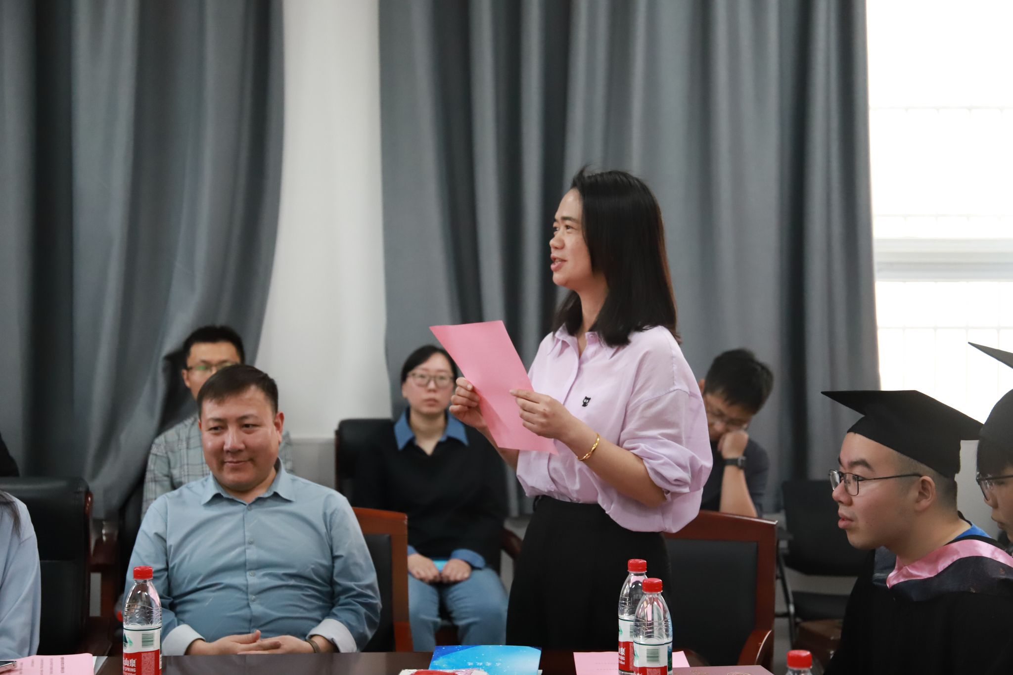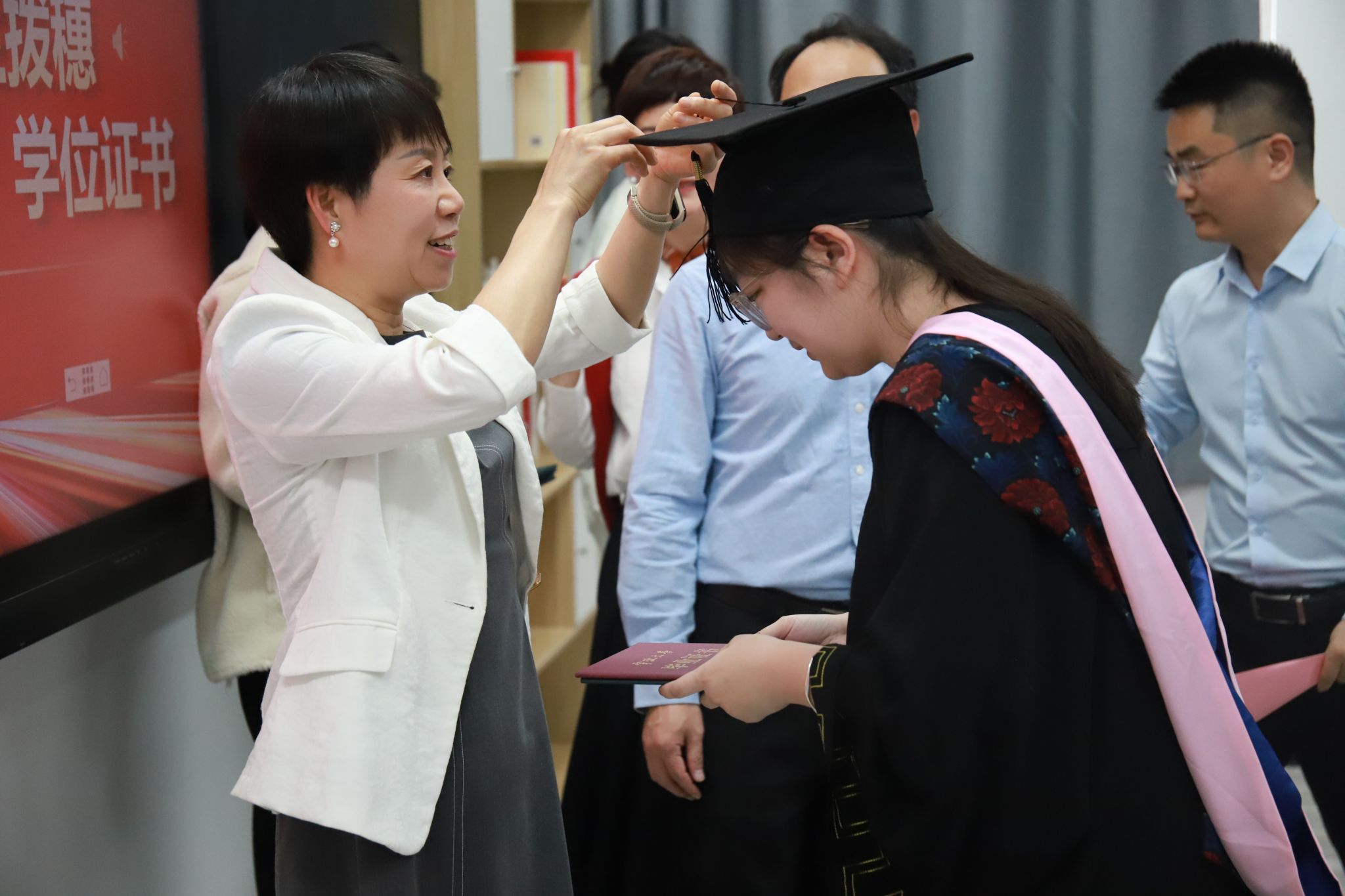 在庄严的国歌声后,负责本科教学的副院长胡子阳郑重宣读了毕业生名单。随后,执行院长段香梅等学院领导为每位毕业生拨正流苏、颁发证书,这个传统仪式的每个动作都饱含深意——流苏从右至左的轨迹,恰似这些学子曲折却坚定的求学之路。那两本沉甸甸的毕业证和学位证,记录着他们突破"学术势垒"的每一个关键参数。这一特殊的仪式不仅是对5位同学永不言弃精神的最好肯定,也象征着他们即将开启人生新的篇章。