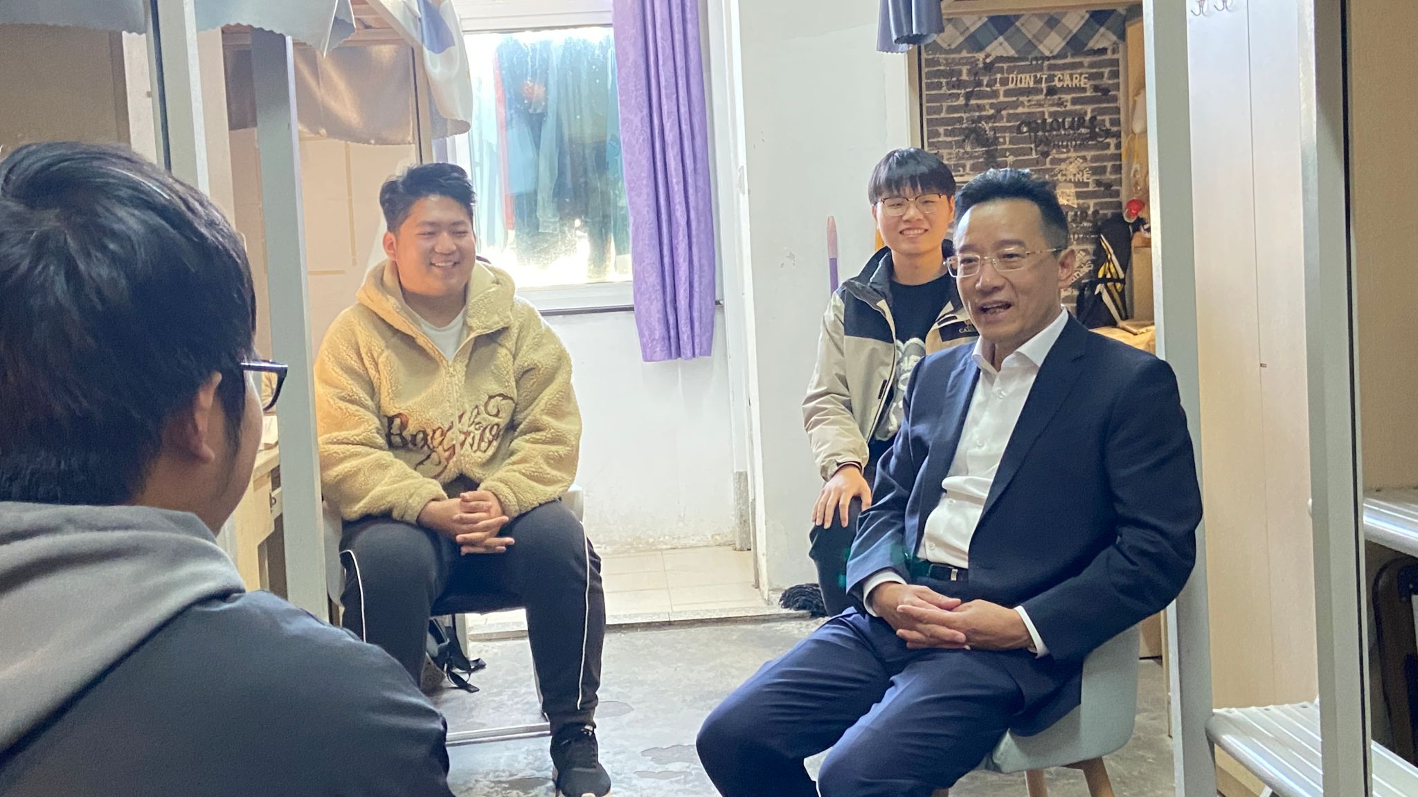 12月6日下午,学校党委书记朱达深入物理学院学生寝室,与同学们进行了亲切而深入的交谈。此次走访旨在更好地了解学生们的学习生活状况,关心学生的身心健康,以及倾听学生们的需求和建议。朱书记的再次来访,让学生们充满期待。朱书记坐在寝室中与学生们拉家常,询问他们近期的学习情况、生活状况,未来规划等。他饶有兴致地听学生们讲述各自的学习生活感受。当听到寝室4人都有意向考取研究生时,朱书记高兴的给予了鼓励,并...